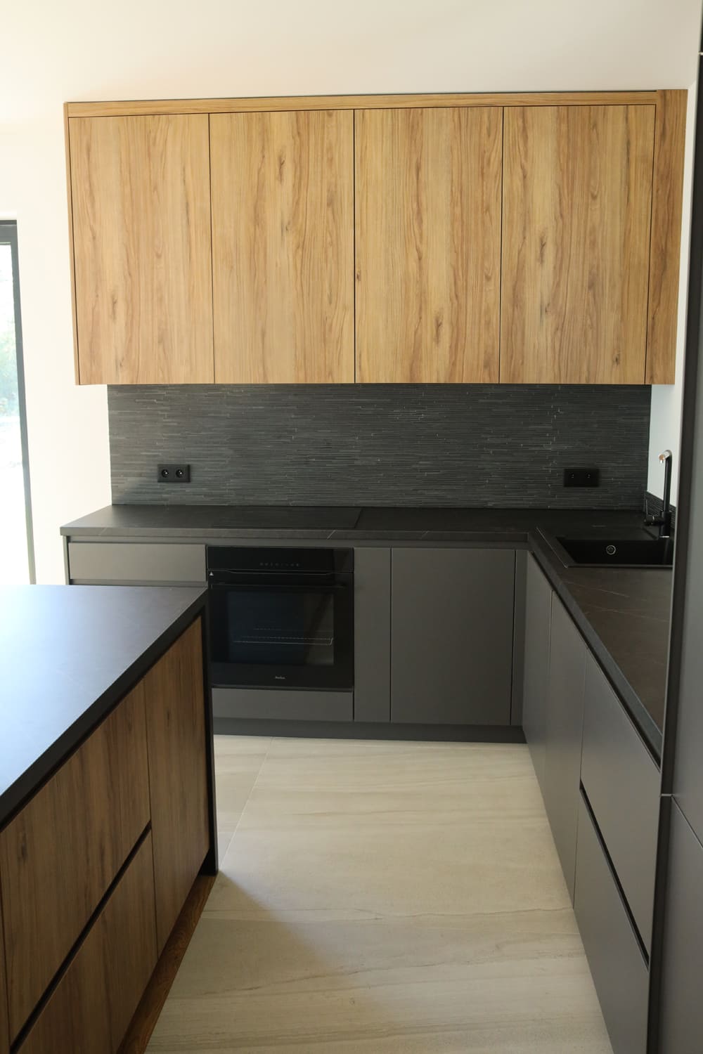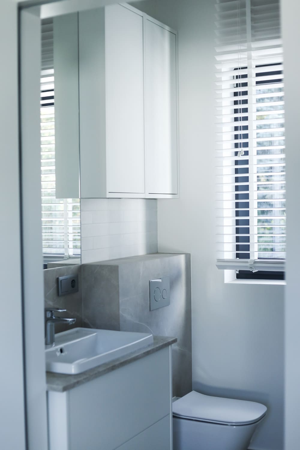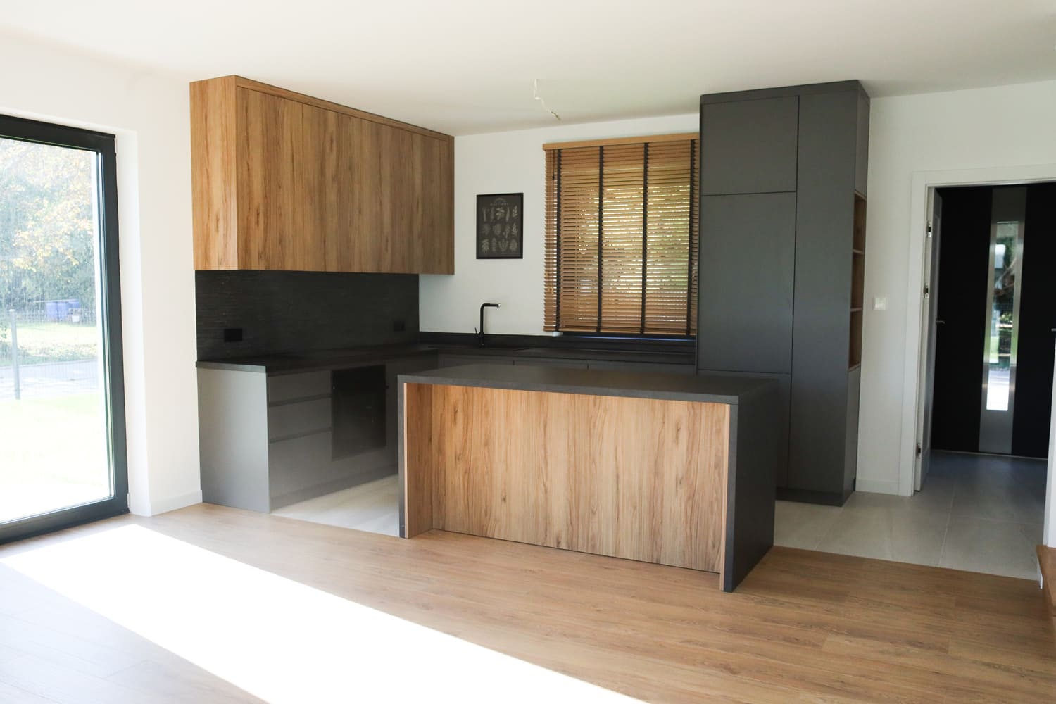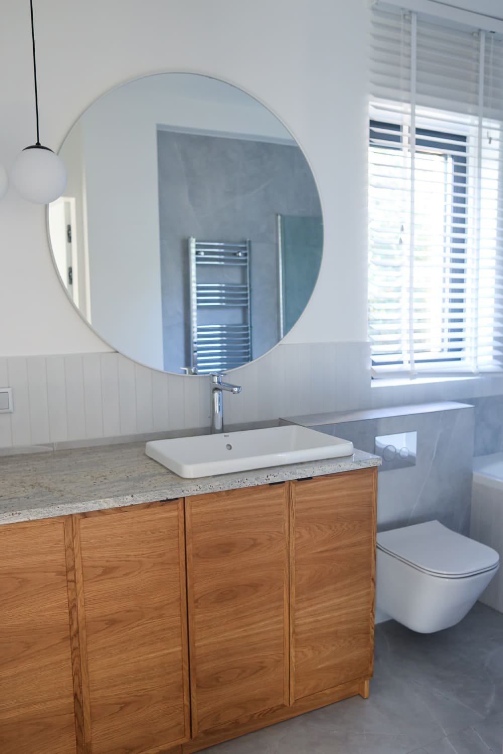 Na parterze mieści się przestronny salon z kuchnią w zabudowie oraz wyjściem do ogrodu, toaleta dla gości i wiatrołap. Garaż w bryle budynku oraz pomieszczenie techniczne z osobnym wejściem zapewniają dodatkową funkcjonalność.